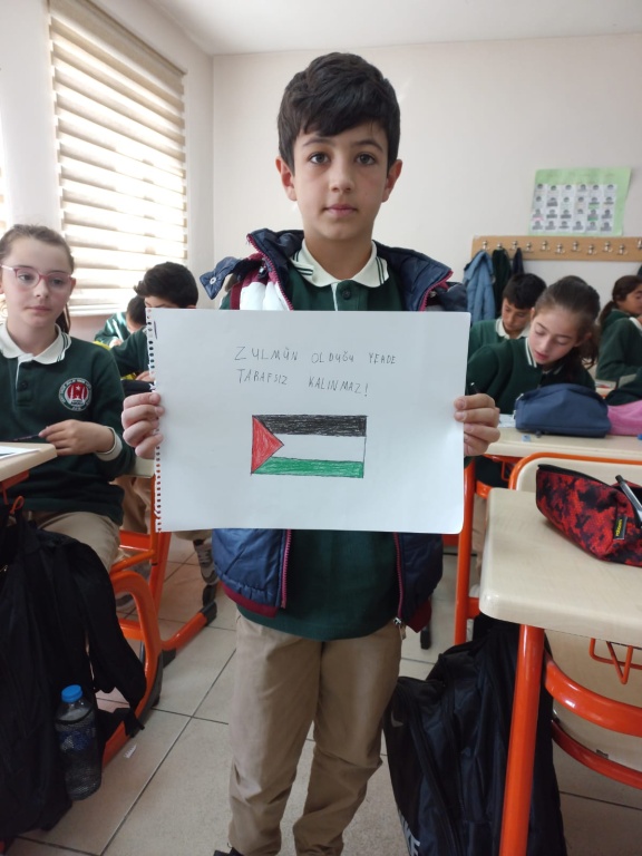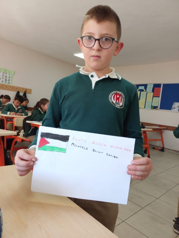 Filistin'de yaşanan insan hakları ihlallerinin sona erdirilmesi ve gençlerimizin insan hakları, demokrasi ve ortak sorumluluk bilincine ilişkin duyarlılığını en üst düzeyde güçlendirmek amacıyla bugün eş zamanlı gerçekleştirilecek olan farkındalık etkinliklerini okulumuzca gerçekleştidik.